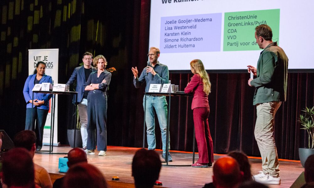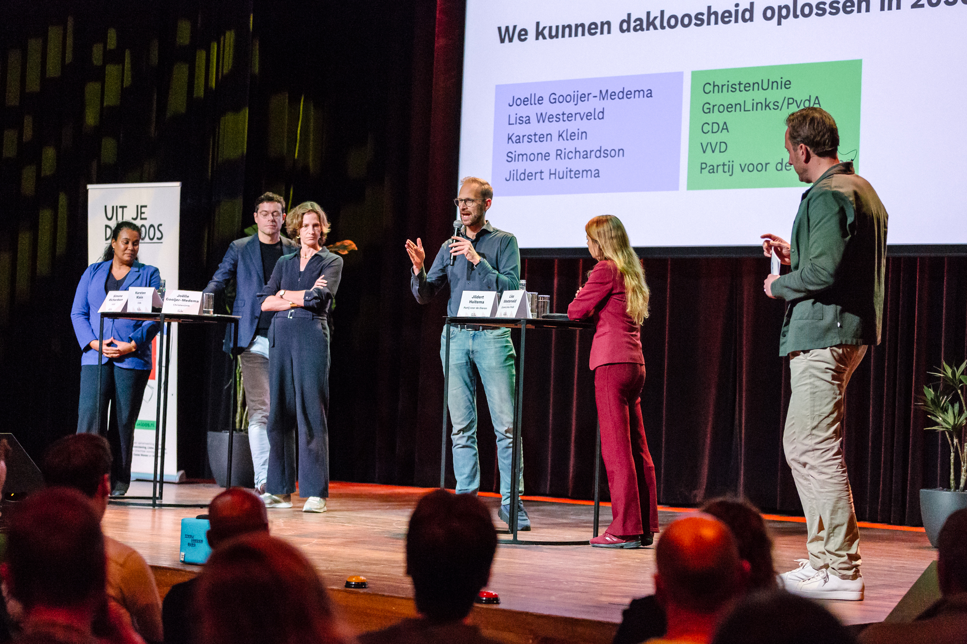 De politieke partijen op het podium waren het over één ding eens: dakloosheid moet worden aangepakt. De wegen daarheen verschilden. Van “bouwen, bouwen, bouwen”, tot het verbeteren van doorstroom in sociale huur, tot meer aandacht voor preventie en het bij elkaar houden van gezinnen.